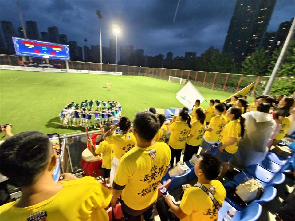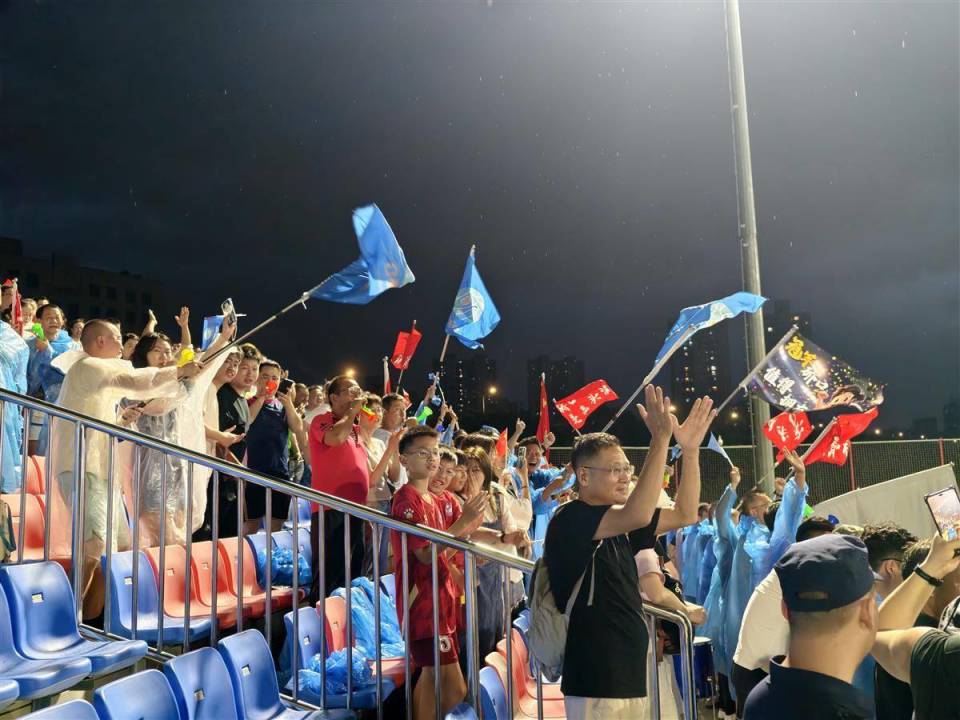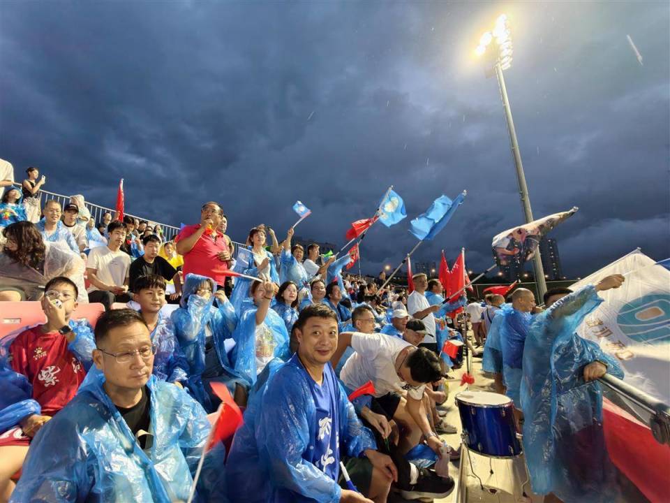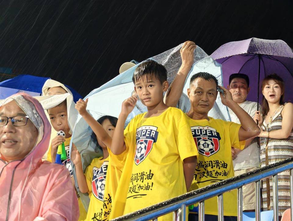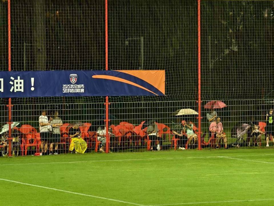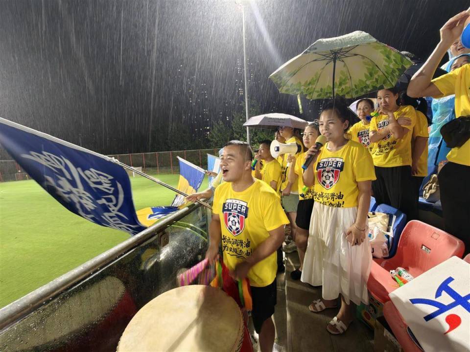 现场暴雨如注,球迷区甚至可以看到闪电。但球迷们依然热情不减,运动员在雨中奋力拼搏。上半场第43分钟时,硚口区代表队以3∶1的比分领先长江新区代表队。